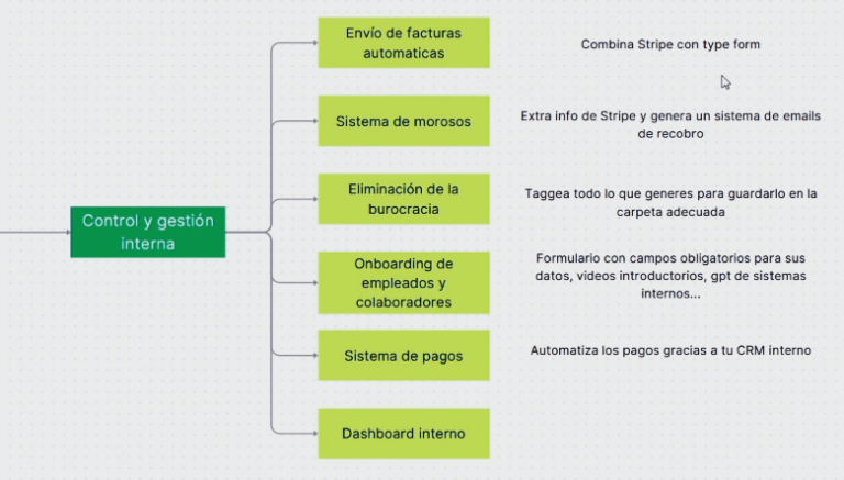 Llegamos al último apartado: el control y la gestión interna. Esta es una de las áreas que más se suelen descuidar, ya que no está directamente relacionada con la actividad principal de la empresa. Sin embargo, aquí es donde podemos automatizar procesos clave como la facturación, la gestión de pagos y la organización documental, lo que nos permitirá ahorrar tiempo y evitar errores.