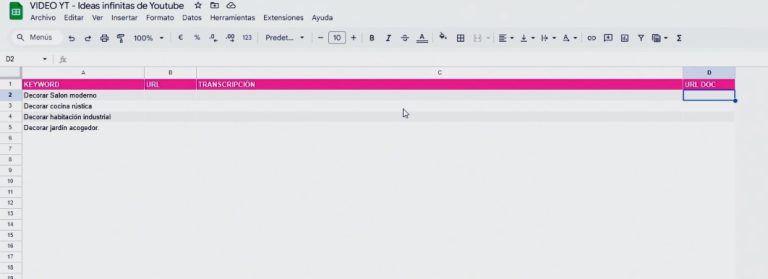 Keywords: Decide qué tipo de vídeos de YouTube quieres scrapear. Por ejemplo, puedes enfocarte en temas de decoración o cualquier otro de tu sector.