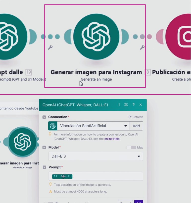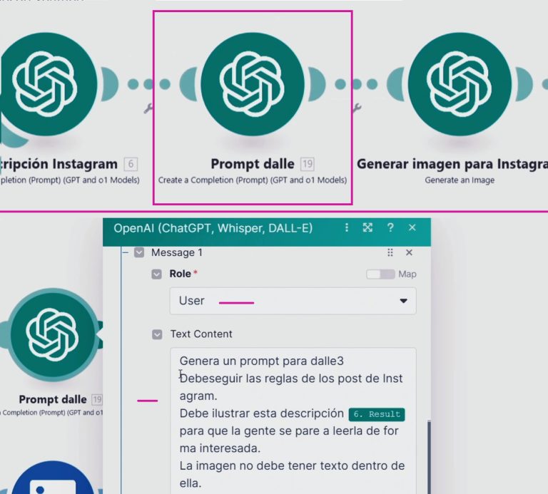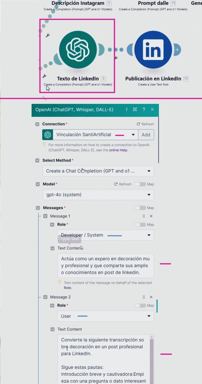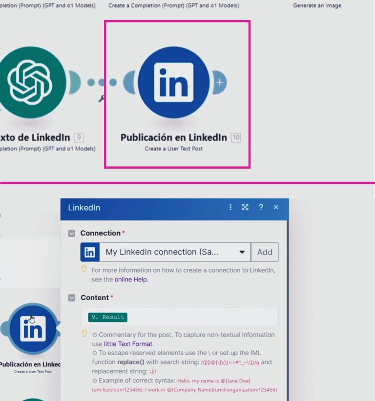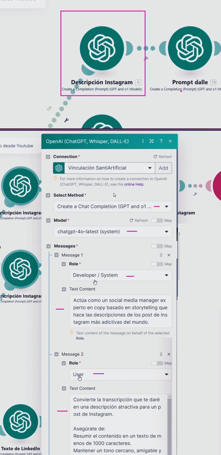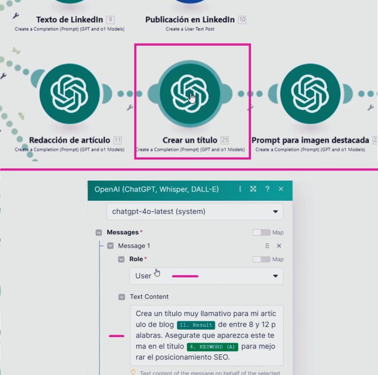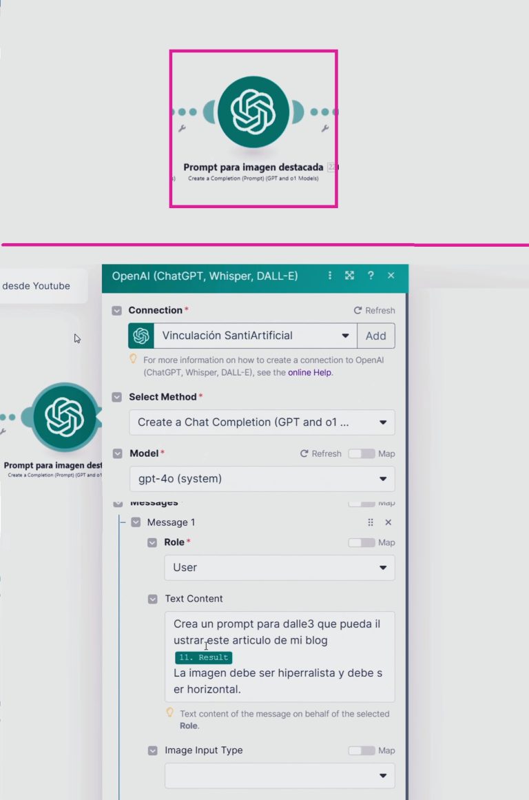 En el campo Content, coloca el resultado que obtuviste de ChatGPT en el paso anterior ({{14.result}}). Esto incluirá el guion de YouTube generado por ChatGPT.