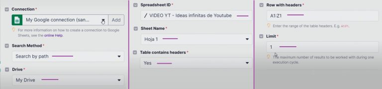 En el campo Sheet Name, selecciona el nombre de la hoja que estás utilizando (por ejemplo, Hoja 1).