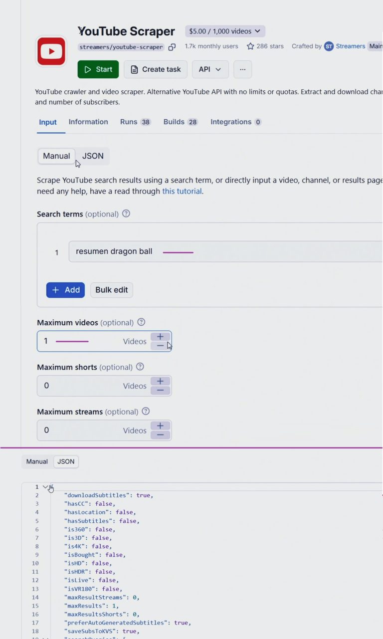 Ajusta el número máximo de vídeos a 1 (buscaremos solo un vídeo por idea).