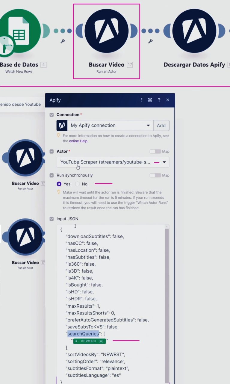 Paso 3: Configurar el módulo Run an Actor con el JSON de Apify
