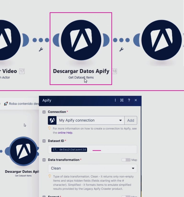 Este módulo permitirá que los siguientes pasos lean los datos extraídos desde Apify.