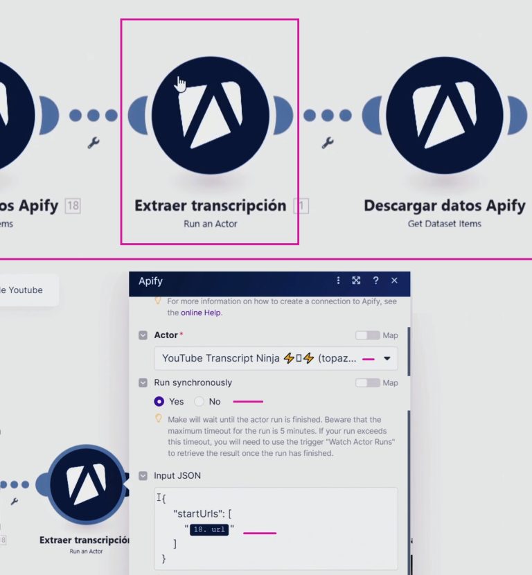 Ahora tendrás toda la información de la transcripción generada por Apify disponible dentro de Make para trabajar con ella en los siguientes módulos.