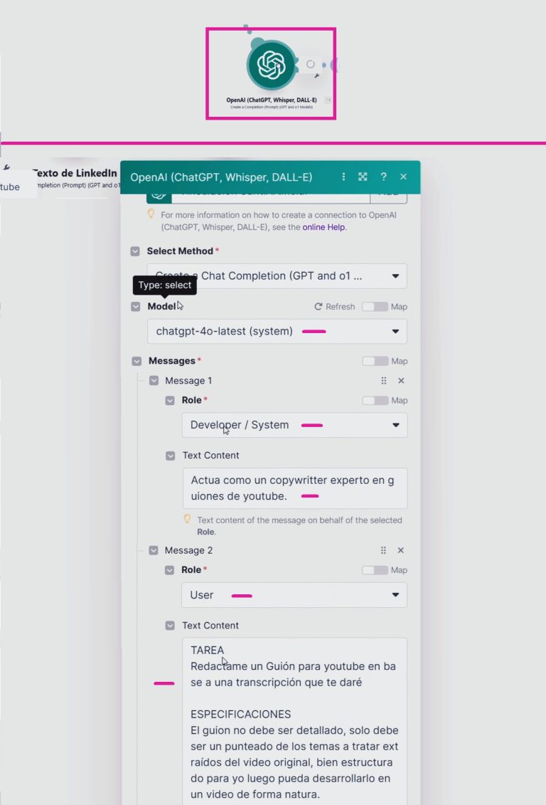 Utiliza el módulo Create a Completion para generar un guion de YouTube.