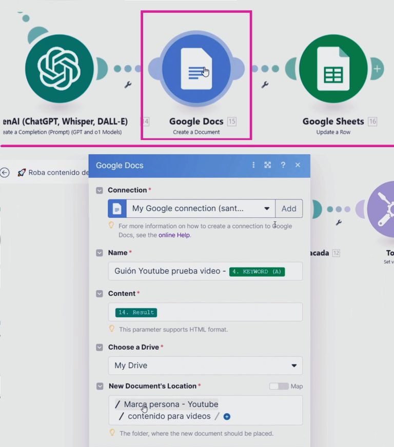 Ejecuta el escenario para crear el documento de Google Docs con el guion de YouTube.