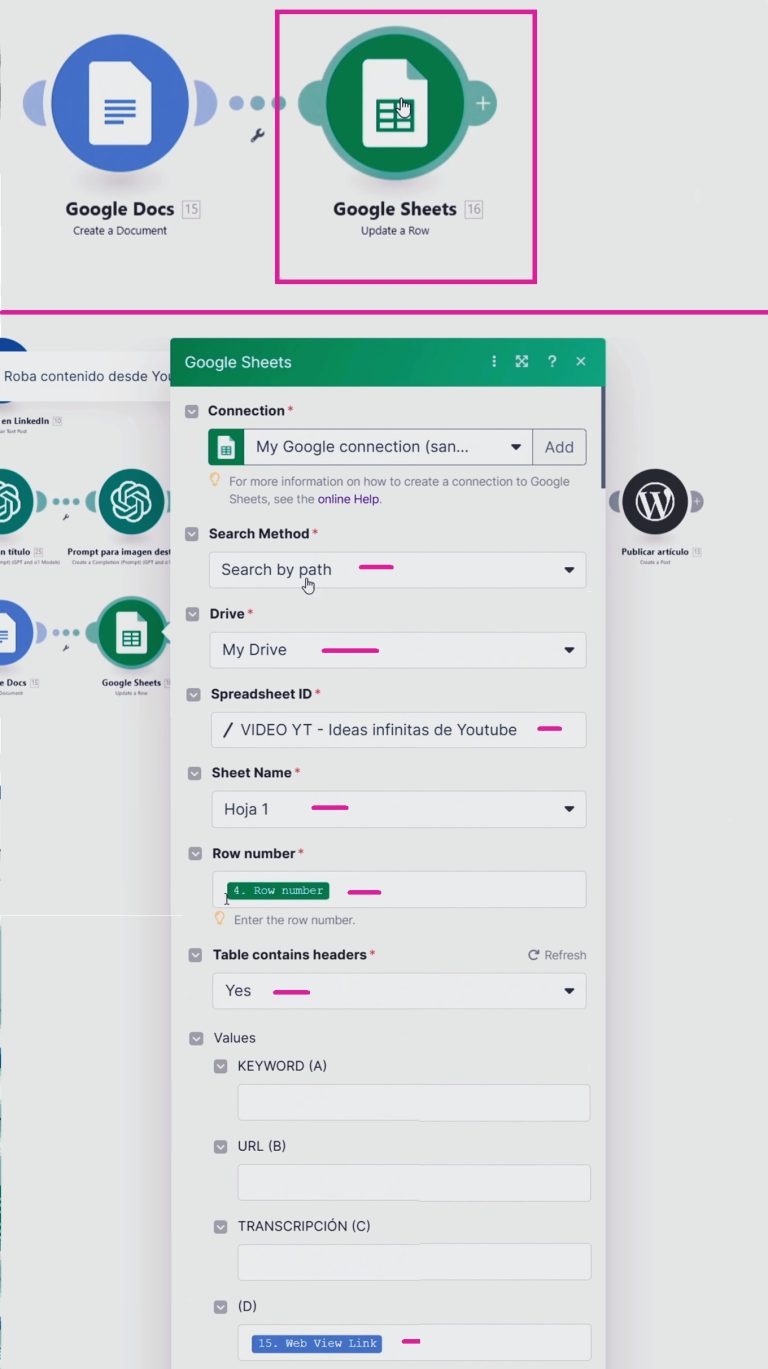 En el campo Row number, selecciona la fila en la que estás trabajando. Usa la variable {{4.row number}} para apuntar a la fila correcta, que es la misma fila desde el inicio del proceso.