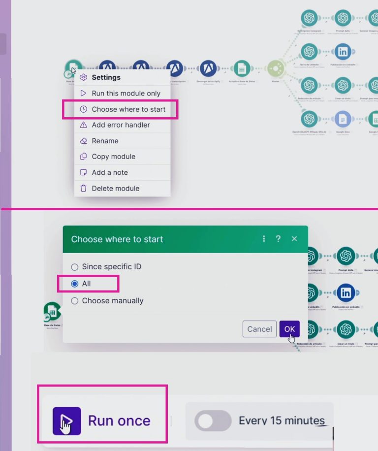 Haz clic con el botón derecho sobre el primer módulo de tu escenario (el primer módulo de todo el flujo de trabajo).