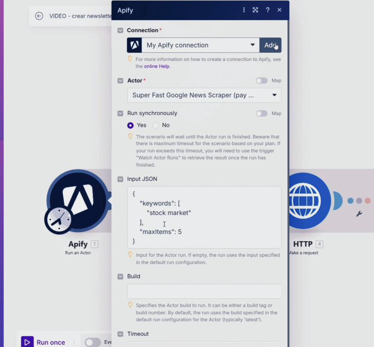 Una vez configurado el scraper en Apify, el siguiente paso es ejecutarlo para obtener las noticias en tiempo real. Para ello, utilizaremos el módulo Run An Actor, que nos permite lanzar el proceso de extracción de datos.