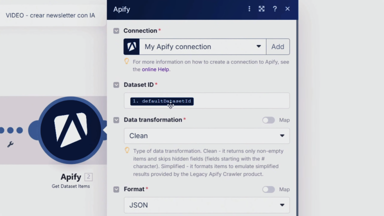 Después de ejecutar el scraper, ahora necesitamos recuperar las noticias extraídas para poder procesarlas. Para ello, utilizaremos el módulo Get Dataset Items en Apify.