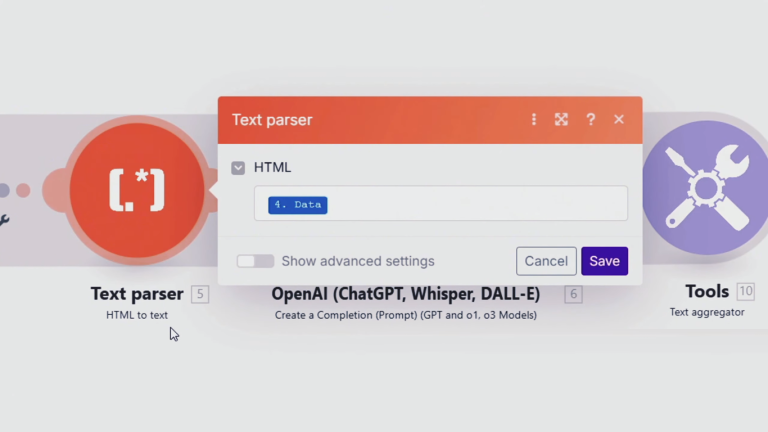 Agrega el módulo HTML to Text – Text Parser en Make.