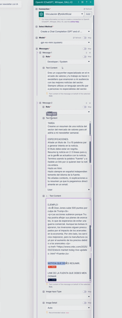Para proporcionar contexto a ChatGPT, incluimos el texto de la noticia procesada en el paso anterior (extraído con HTML to Text – Text Parser).