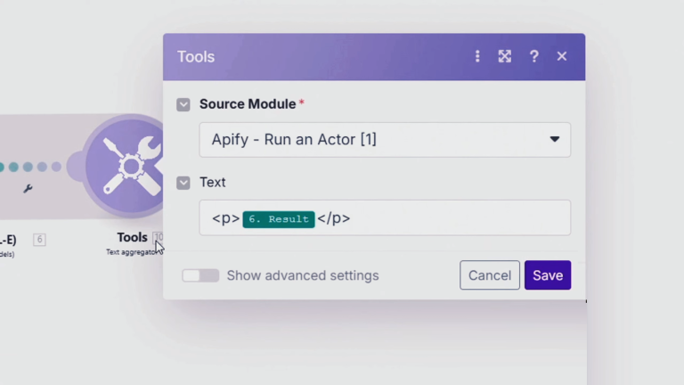 Ahora que hemos generado cinco resúmenes de noticias con OpenAI, el siguiente paso es unirlos todos en un solo bloque de texto. Para esto, utilizaremos el módulo Text Aggregator – Tools en Make.