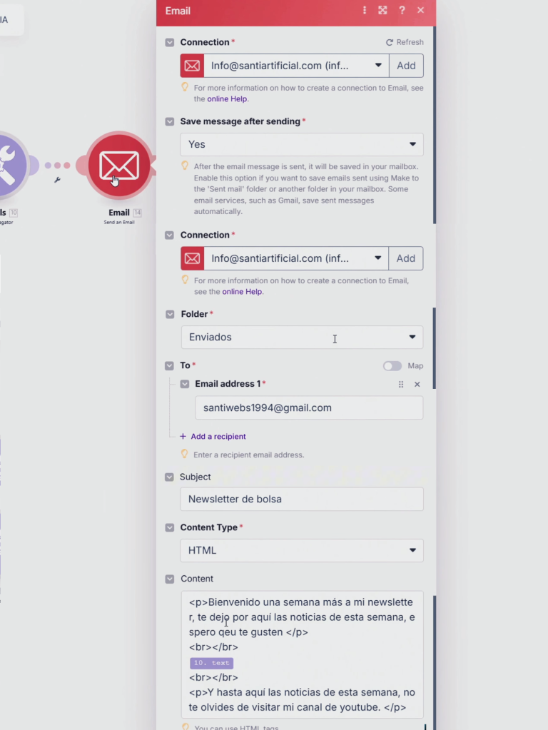 El último paso en la automatización es enviar la newsletter. Para este ejemplo, usaremos un email profesional con dominio propio, pero también podríamos hacerlo con Gmail, Outlook, o integrarlo con plataformas de email marketing como Mailchimp o ActiveCampaign.