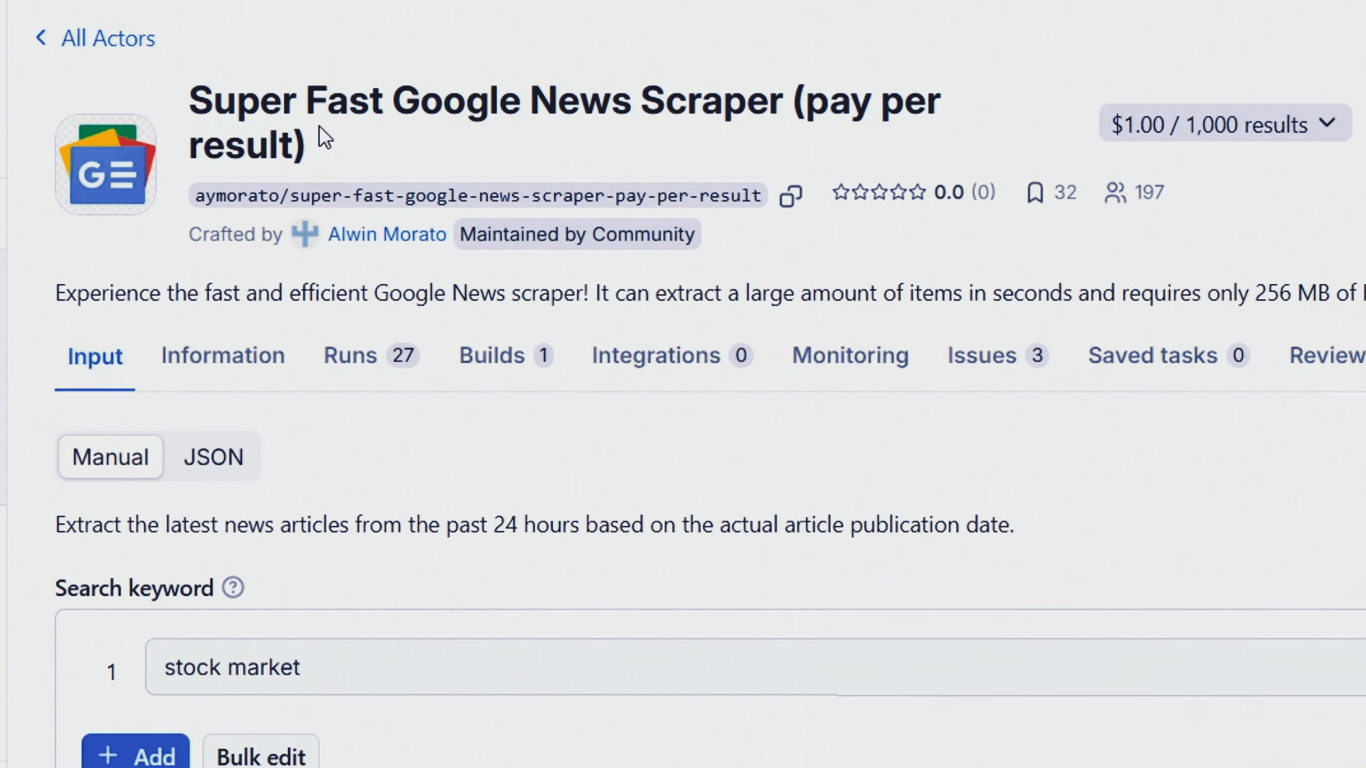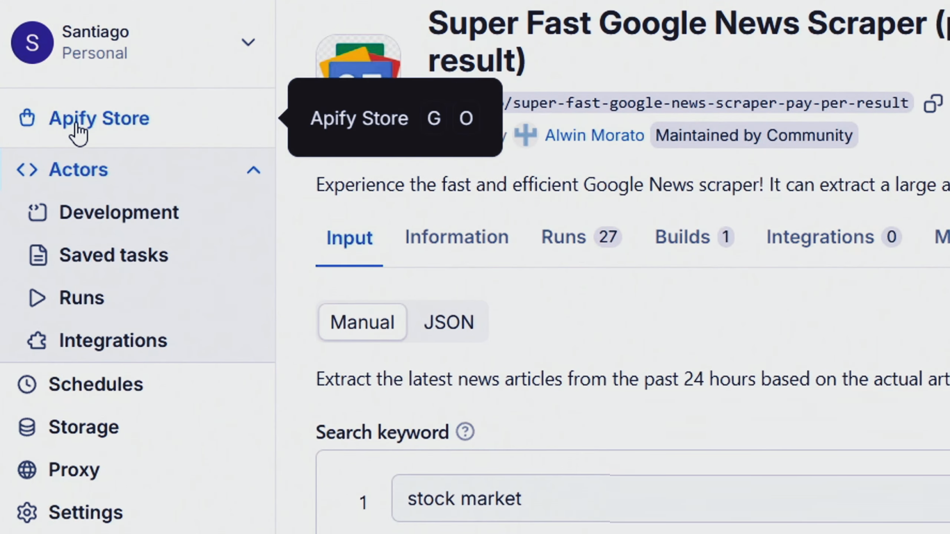 Paso 1: Extraer Noticias con Apify – Super Fast Google News Scraper