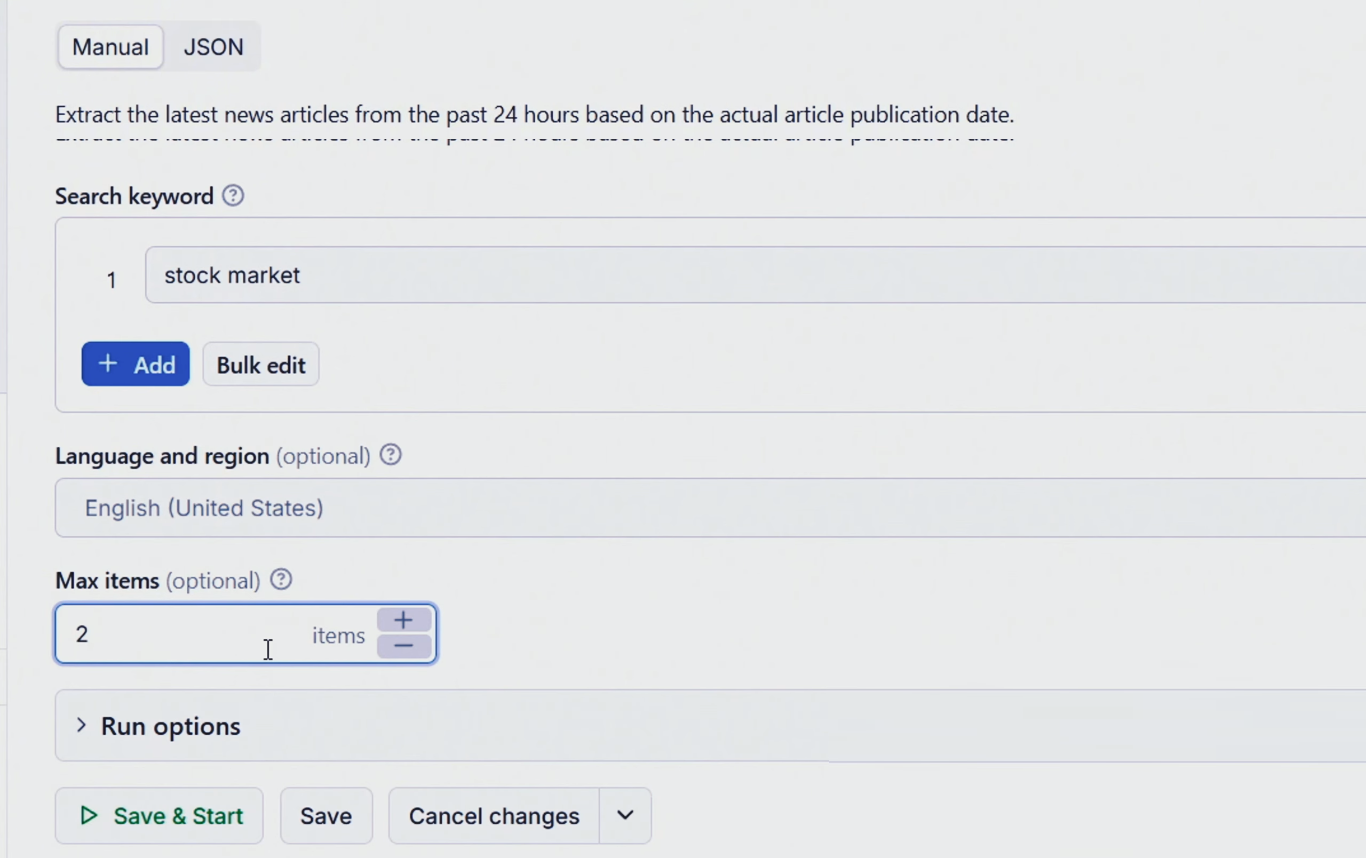 Máximo de elementos (Max Items): Se recomienda establecerlo en 2 al principio para minimizar costos mientras realizas pruebas.