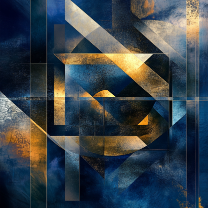 A surreal digital artwork with geometric abstraction, deep blue and gold tones, dreamlike textures, high resolution --q 2 --style 4b