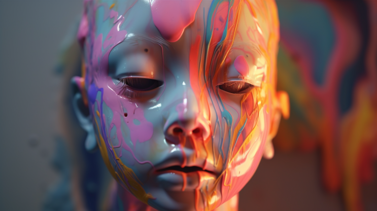 A surreal abstract painting of a doll with fluid shapes, distorted forms, and neon pastel colors, dreamlike textures, high detail, ultra-realistic reflections, 4K --ar 16:9 --v 5