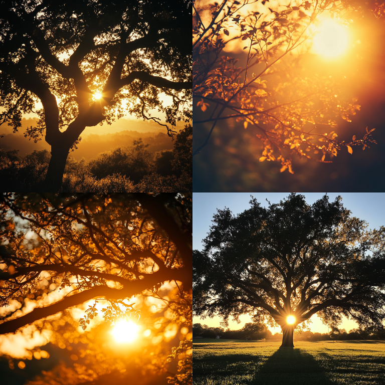 «Tree silhouette during golden hour, warm sunlight filtering through branches, glowing atmosphere, peaceful mood, natural lighting»
