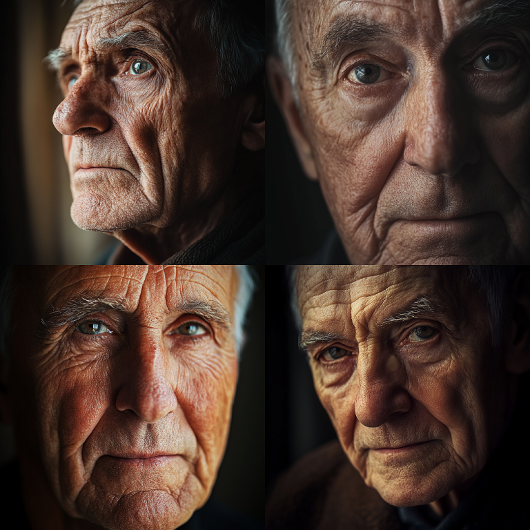 «Close-up portrait of an elderly man, soft window light illuminating one side of his face, shallow depth of field, high detail, natural light photography»