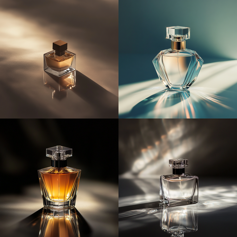 «Perfume bottle on a reflective surface, dramatic spotlight from above, crisp shadows, minimalist studio background, luxury product photography style»
