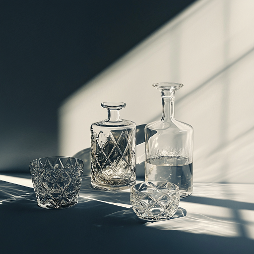Still life with glass objects under studio lighting, sharp shadows and reflections, minimalist composition, ultra-detailed, high resolution