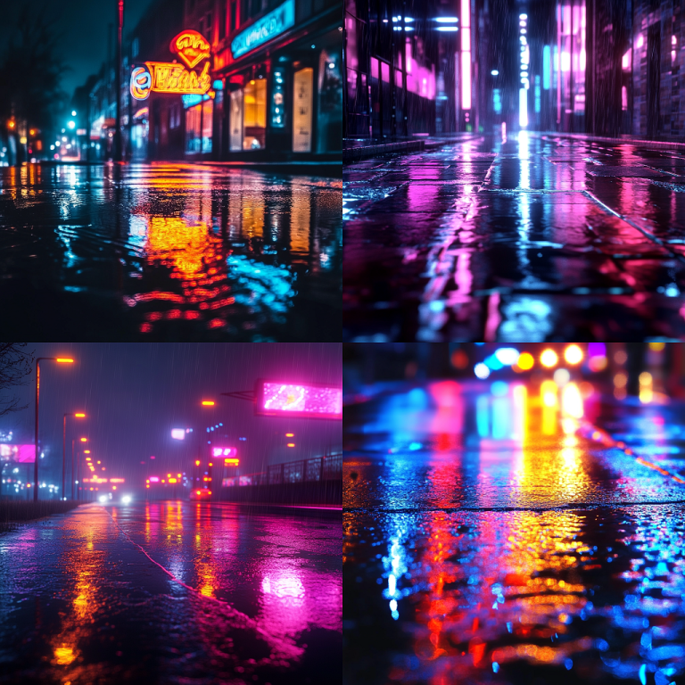 «City street at night, wet pavement reflecting vibrant neon lights, high contrast, moody atmosphere, cinematic lighting, 4K»
