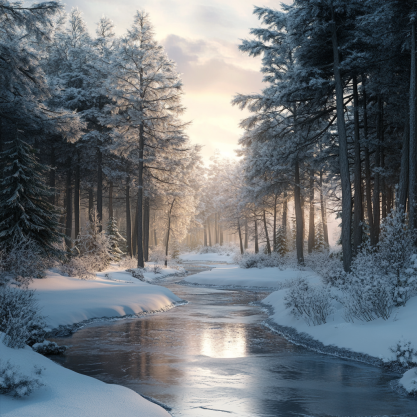 «Bosque cubierto de nieve con un río parcialmente congelado, árboles altos con ramas nevadas, ambiente frío pero pacífico, estilo fotorrealista.»
