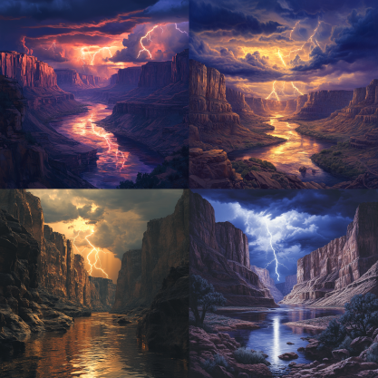«Cañón rocoso con tormenta eléctrica en el horizonte, relámpagos reflejándose en el río.»