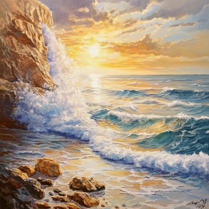 «Acantilados junto al mar, olas golpeando las rocas, puesta de sol dorada reflejada en el agua, brisa marina visible en la espuma.»