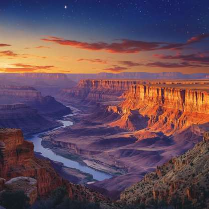 «Paisaje del Gran Cañón al atardecer, tonos anaranjados y rojos, río serpenteante en el fondo, cielo despejado con estrellas apareciendo.»