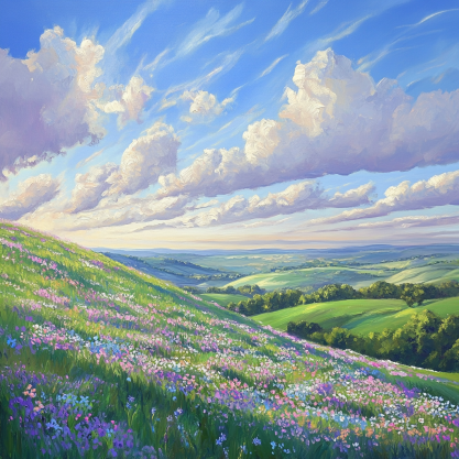 «Colinas verdes cubiertas de flores silvestres, cielo azul con nubes algodonosas, iluminación suave al amanecer, estilo pintura impresionista.»
