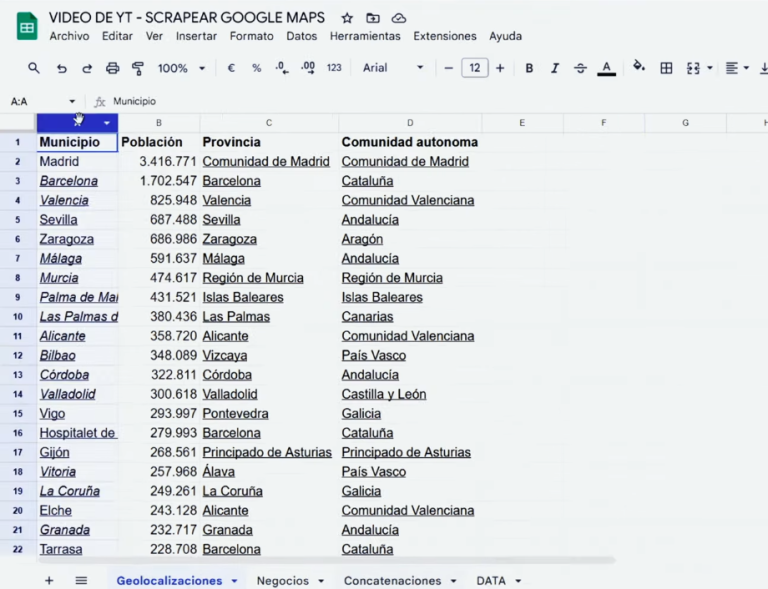 Lo primero que necesitamos es una columna con todas las ubicaciones de las que queremos extraer información. En mi caso, como vivo en España, he acudido a Wikipedia y he copiado el listado de municipios españoles ordenados por población. Simplemente hice un copiar y pegar, y ahora tengo todos esos datos en la hoja. Incluyo también información adicional como la población, la provincia y la comunidad autónoma, datos que podrían ser útiles más adelante. Pero lo más importante es contar con una primera columna con las localizaciones.
