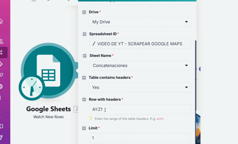 El rango de celdas lo dejamos tal como está, por defecto de A1 a Z1. En el campo de Límite, estableceremos el valor en “1”, ya que queremos que el módulo detecte y procese una sola fila por vez. Esto nos permitirá lanzar el scraper de forma controlada y ordenada.