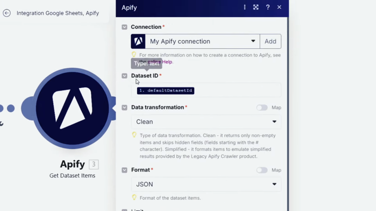 Con nuestro actor ya ejecutado y realizando la extracción de datos desde Google Maps, el siguiente paso en Make es recuperar esa información para poder trabajar con ella. Para ello, vamos a usar el módulo de Apify llamado Get Dataset Items.