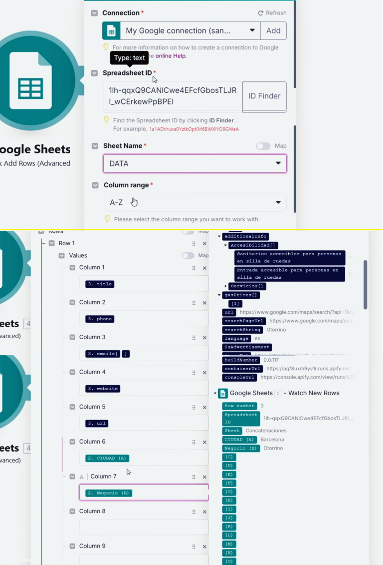 La configuración de este módulo es muy sencilla y probablemente ya estés familiarizado con ella si has trabajado antes con Make. En el campo Spreadsheet ID, debemos colocar el nombre del documento de Google Sheets. A continuación, en el campo correspondiente a la hoja de cálculo (Sheet Name), seleccionamos la pestaña con la que vamos a trabajar. En este caso, como queremos combinar ciudad y negocio, seleccionaremos la pestaña donde están esas combinaciones, que hemos llamado “concatenaciones”.