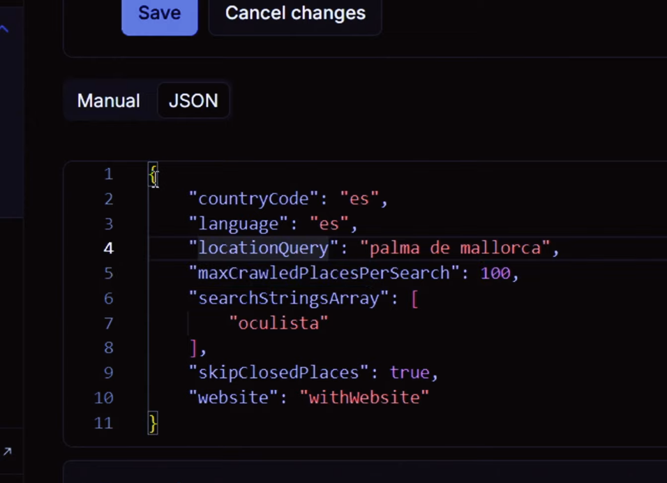 En Input JSON, pega el código generado en Apify. Luego reemplaza los valores estáticos por las variables dinámicas: por ejemplo, sustituye la ciudad por el campo «ciudad» y el tipo de negocio por el campo «negocio». De este modo, el scraper podrá ejecutarse múltiples veces, cada vez con una combinación distinta, como Madrid – otorrino, luego Barcelona – otorrino, etc.
