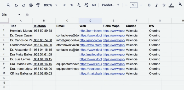 Para confirmar que todo ha funcionado correctamente, fíjate en los números que aparecen arriba en el módulo de Google Sheets: verás que dice «10», lo que indica que se han añadido 10 filas nuevas a la hoja. Si revisas el documento, verás que todos los datos han sido volcados correctamente: nombres de los negocios, teléfonos, emails, webs, enlaces de Google Maps, ciudad y keyword.
